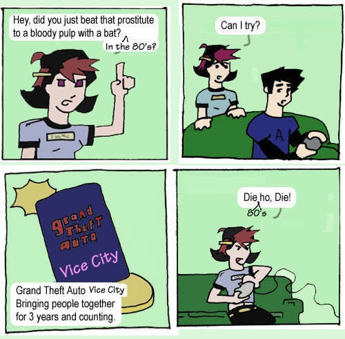 First off I would like to mention that while it looks like I just reused an old (episode 29) joke, I want you to know I did it on purpose. I could argue that rehashing an old comic fits in well with the GTA: Vice City just being GTA3, in the 80's. Now before any fan boy has a heart attack reading that, I love GTA:VC, and I know there are new and improved things, it just still feels like the same game. And I don't mean that in a bad way. I just wanted the comic to portray how since Vice City is the same game, I gave the same comic, just with the 80's.