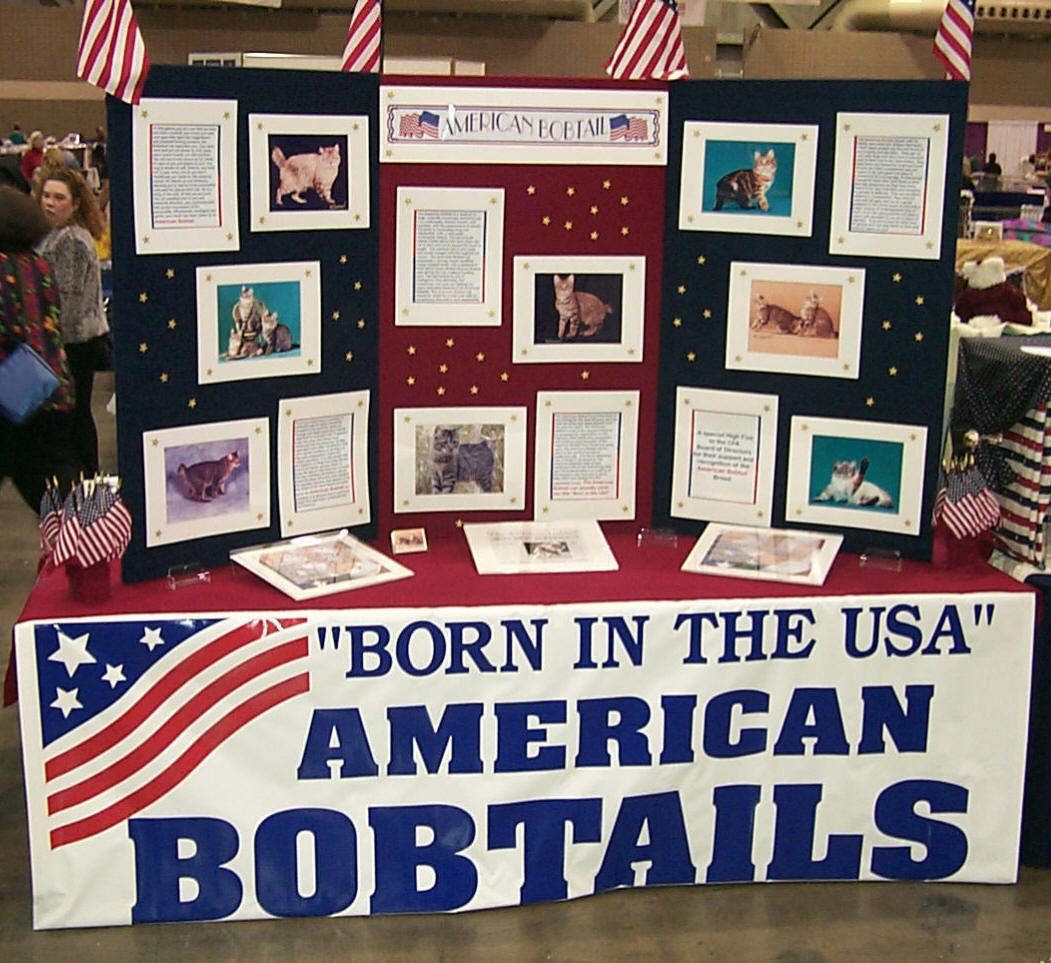 Members of the American Bobtail Breeders Association attended the CFA INTERNATIONAL CAT SHOW IN KANSAS CITY In November of 2000 Here is a picture of our public Breed Booth Presentation The following Members have kittens available or litters due: You can go to their websites by Double Clicking the Cattery name.