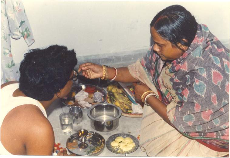 lotus flowers or fish. Rice paste is mixed with Diyas (oil lamps) and agarbattis (incense) to light during the ceremony. One cane plate (Kulo) with grass, rice with husk, curd, kajol, sweet and water Now-a-days, this ceremony is also crashed in those three days. Usually the elder's from the brides family come during the morning to grooms family for ashirwaad.