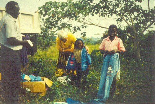 Generous givers provide clothing for the children. Here, Robert is thrilled to get Mickey Mouse pants, though they are very big for him.
