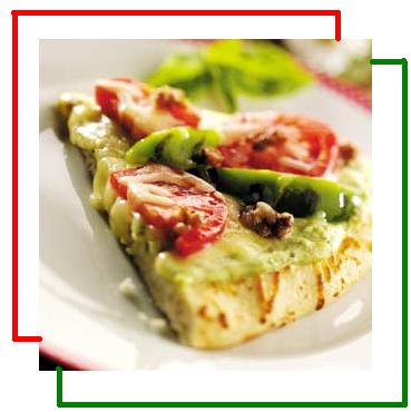 Fajita Pizza Pizza topped with Chicken Breast Halves, Bell Peppers, Onions, Garlic, and Sour Cream. |