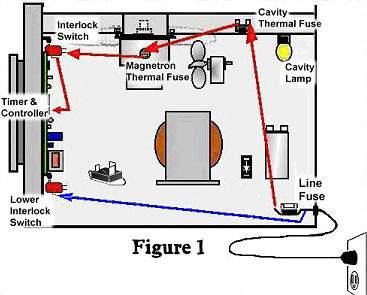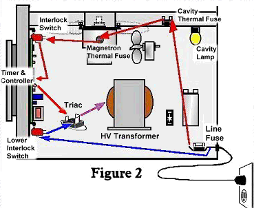 * It enters the microwave oven through a series of safety fuse protection circuits. These fuses and safety circuits are designed to deactivate the microwave oven if an electrical short or overheating occurs.