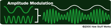 Amplitude Modulation - Both AM radio stations and the picture part of a TV signal use amplitude modulation to encode information. In amplitude modulation, the amplitude of the sine wave (its peak-to-peak voltage) changes. So, for example, the sine wave produced by a person's voice is overlaid onto the transmitter's sine wave to vary its amplitude.