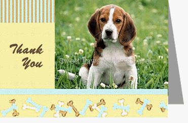 The dog greeting cards, announcements and invitations and Thank You cards are printed on flat gloss one side card stock making them more affordable. They are 5" x 7" $1.90 each plus shipping charge. They are sold as a set of 10 greeting cards and 10 envelopes. They are printed in Handcock script to match the card. Standard shipping is $3.50 per set and just $1.50 more for each additional set.