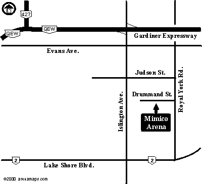 From Gardiner Expressway: Gardiner Expy. to Islington Ave. exit. South on Islington to Judson St. Left on Judson to Royal York Rd. Right on Royal York to Drummond St. Right on Drummond to Mimico Arena. Arena is on the left side of the road.