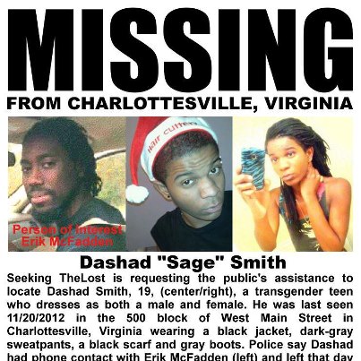 ********* ********* http://cruci34.angelfire.com/kristimerrill.html Free JavaScripts provided Dashad SAGE Unique Smith Missing From Charlottesville, Va since Nov 20th Help Find this Young Person Transgender teen missing Virginia Satellite pictures to help police find the missing and reduce crime drone surveillance to find the missing
