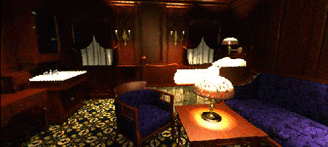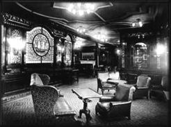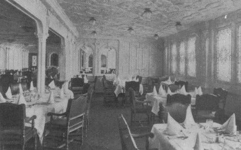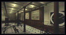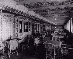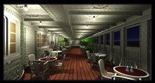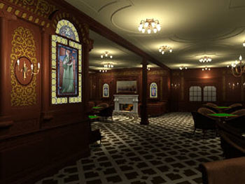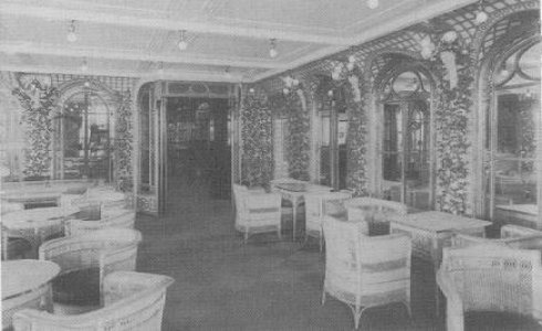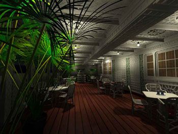 Cd-rom simulation of the Titanic's palm court, very similar to what it looked like in color, very beautiful and filled with palm.