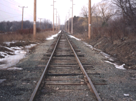 Note that at the time this picture was taken (1/2003) the crossing is not yet complete. Eventually the top will span 218 and the trash bags will be taken off the lights. The line then continues on through Bloomfield Center