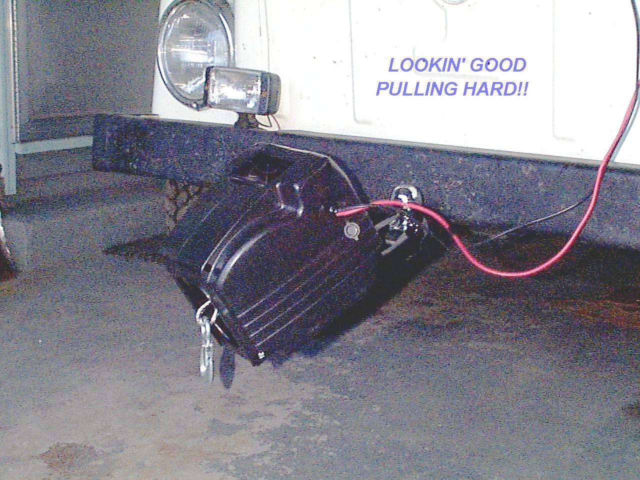 Well thats all the pictures, the duckboards are made out of 1"x2" furring strips, they are cheap andget the job done. I just made a cardboard template of the floor, and half lapped the joints to make them sturdy, screwing them together. They look great and wear nice. Just a tip, on the underside attach no slip carpet stuff, that rubber webbing you place under small carpets so they don't slide around. This will quiet any raddles, and lift them off the floors eliminating rust problems. Now as far as the winch goes, you have to make the hitch cause they are impossible to come by. I made the bar out of two pieces of 1/4" thick X 2" wide steel bar stock, I doubled them up to get a 1/2" thick bar. I know its over kill and rather beefy, but why not make it last! Then I took two pieces of 1/8" thick X 2" wide angle iron and doubled them up. Bolt the bar to the center of the angle iron, get it all welded and place two 3" long 1/4" thick bars on the angle iron on both sides of the bar to give the angle iron more strength. See the above pictures, they should clairify any questions you have right now. I had mine MIG welded for about $30 bucks, total cost was about $50.00 and its stronger than you can imagine. You should have seen the face of the guy that welded it, all he could say was your putting this on a thing, why, why so thick, for what?? Oh well, you had to be there. I know these directions are sketchy, I don't have any measurements, thats cause I'm at school and forgot to bring them with me. I get out in May, so when I get home I'll measure up the hitch and add the measurements up here for ya. Have fun making it, take your time cutting the steel, it is thick so I used a steel cutting blade in a jig saw, worked great!!