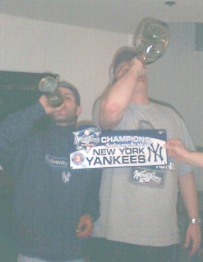 What kind of Yankee Victory Party would be complete without a toast? Here you see Tranniman (barely standing, drinking the Greek Whiskey on the left) and Brother Frank enjoying a bit of Yankee wine. This is the last known photo of The Tranniman. He failed to make it to the parade on Monday. Was anyone surprized? |