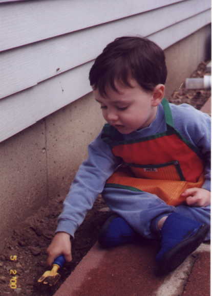 This week we were doing The Carrot Seed by Ruth Krauss. Samuel dug up the dirt along the back walkway and planted marigold seeds, then watered them. He's been watching the dirt everyday since then! :o)