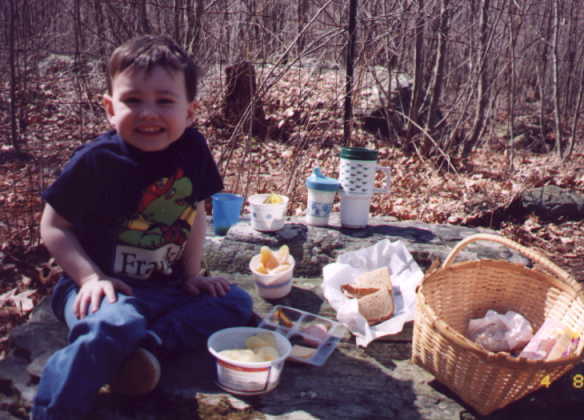 This is a picture of Samuel on one of our picnic lunches. We pack a basket and eat on a rock in the woods out back. Lunch doesn't always have to be eaten at the table you know. After our picnic, we ALWAYS go on a bug hunt! :o)