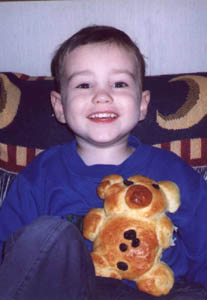 This picture was taken of Samuel and the bear bread we made. We were doing the book Jesse Bear, What Will You Wear? by N.W. Carlstrom for the week. I always try to incorporate a craft/activity every day for the book we are doing that week.
