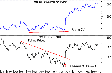 One useful method of interpreting the CVI is to look at its overall trend. The CVI shows whether there has been more up-volume or down-volume and how long the current volume trend has been in place. Also, look for divergences that develop between the CVI and a market index. For example, is the market index making a new high while the CVI fails to reach new highs? If so, it is probable that the market will correct to confirm the underlying story told by the CVI.