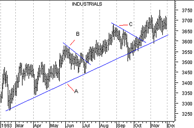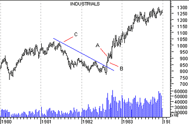 When a reversal in the primary trend is signaled by both the Industrials and Transports, the odds of the new trend continuing are at their greatest. However, the longer a trend continues, the odds of the trend remaining intact become progressively smaller. The following chart shows how the Dow Industrials registered a higher high (point "A") and a higher low (point "B") which identified a reversal of the down trend (line "C").
