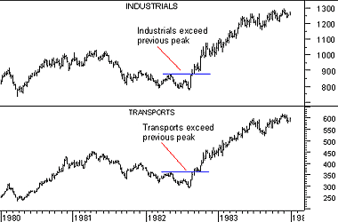 The Industrials and Transports must confirm each other in order for a valid change of trend to occur. Both averages must extend beyond their previous secondary peak (or trough) in order for a change of trend to be confirmed.