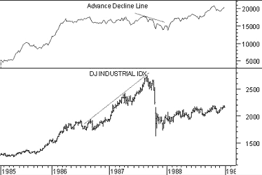 The DJIA was making new highs during the 12 months leading up to the 1987 crash. During this same period, the A/D Line was failing to reach new highs. This type of divergence, where the generals lead and the troops refuse to follow, usually results in the generals retreating in defeat as happened in 1987.