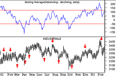 The following chart shows the DJIA and a 40-day moving average of the Advancing-Declining Issues indicator.