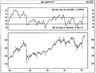 The Bull/Bear Ratio is a market sentiment indicator. Dr. Martin Zweig sums up sentiment indicators in his book Winning On Wall Street by saying, "Beware of the crowd when the crowd is too one-sided." Extreme optimism on the part of the public and even professionals almost always coincides with market tops. Extreme pessimism almost always coincides with market bottoms.