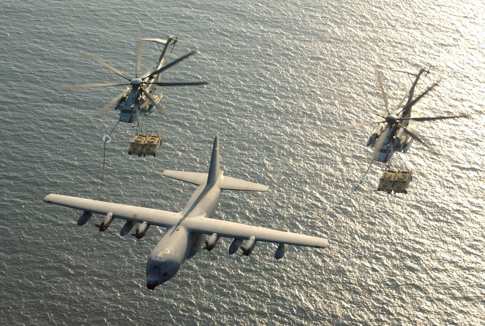 MH53E towing an Anti-Mine Counter-Measures sled (A.M.C.M.)