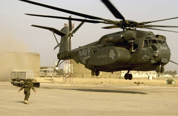 Big MH-53E SEA DRAGON tows a mine countermeasures sled to clear dangerous waters off Iraq.