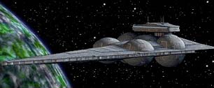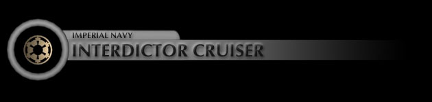 The Interdictor Cruiser, also known as the Immobilizer 418 Cruiser, at 600 meters long may just look like a small version of a Star Destroyer, but it carries an artificial gravity-well generator and four huge gravity-well projectors. When activated, this gravity-well generator prevents nearby ships from escaping into hyperspace. Any ship traveling in hyperspace when it hits the gravity-well will instantly br converted to realspace. Interdictors are placed on the perimeter of the battle area. This gives the captains a claer view of any battle so they can presicely target the placement of gravity-wells to prevent any ships from escaping into hyperspace. The Interdictor usually carries no weapons. The hull can be filled with a wide variety of weapons and the ship systems can be easily converted for custom mission duties. The biggest disadvantage with the Interdictor Cruiser is that the gravity-wells can take more than a minute to charge up, giving quick-thinking opponents a chance to escape into hyperspace while they're charging up.