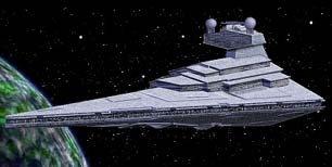 The Imperial Star Destroyer is the core of the Imperal Navy. These awesome wedge shaped ships are stationed at every Imperial system to help keep order. Star Destroyers are 1,600 meters long and have over one humdred weapon emplacements. This includes sixty turbolasers and sixty ion cannons. Star Destroyers have both an aft docking bay and a forward launch bay. The aft serves as the main launch and landing bay for shuttles, support and cargo ships, and TIE Fighters. The forward launch bay is used to deploy assault shutles, walker landing barges, and ground forces vehicles. A standard Star Destroyer carries a full wing of 72 TIE Fighters. This is usuallly composed of four squadrons of TIE/lns, one squadron of TIE Interceptors, and one squadron of TIE Bombers. Support ships aboard a Star Destroyer include eight Lambda Shuttles, 15 Stormtrooper Transports, five Assault Gunboats, and a variable numer of Skipray Blastboats and Gamma Assault Shuttles. Within a Star Destroyer's planetary assault teams are Landing Barges, Drop Ships, 20 AT-ATs, 30 AT-STs, and 9,700 ground troops. A Star Destroyer can also deploy a pre-fabricated garrison that includes 800 troops, 10 AT-ATs, 10 AT-STs, and 40 TIE Fighters. An upgraded version of the Imperial Star Destroyer called the Imperial II Star Destroyer came out shortly after the Battle of Yavin. It has a heavily reinforced hull and more powerful turbolasers.