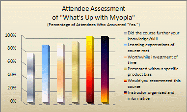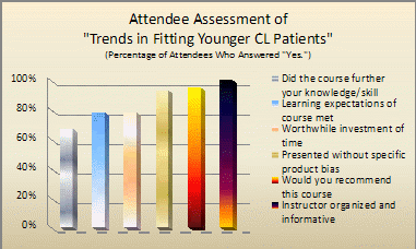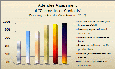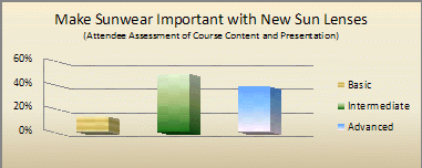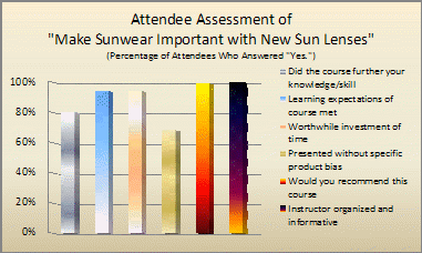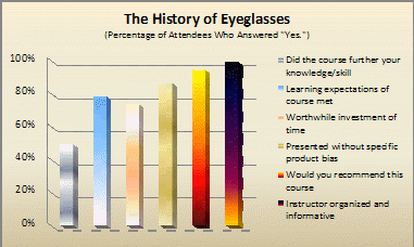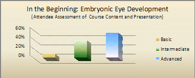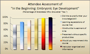 Spring Conference Attendees Give Thumbs Up At the end of each seminar, ABO/NCLE asks attendees to evaluate it based on six questions: Did the course further your knowledge/skill, were the learning expectations of the course met, was the course a worthwhile investment of time, was the course presented without specific product bias, would you recommend this course, and finally was the instructor organized and informative. As you can see from just one course, “In the Beginning: Embryonic Eye Development,” the presenters at the OpticalCEU's 2011 Spring Conference for Continuing Education succeeded as far as attendees were concerned. See the results below.