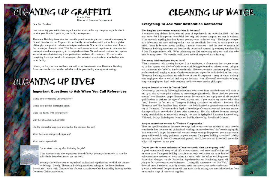 I completed two different folders for Thompson Building Associates, a local family-owned insurance and restoration company. The biggest challenge with this project was to make sure that the design isn't too cheerful ("Oh, goodie! You had a disaster, we get a job!") or too depressing (pictures of horrible flooding, a burnt house, etc.). The first design I submitted was this one. I wanted it to resemble a magazine, something familiar and fairly neutral. The first image is the cover design, showcasing the headlines. The second image is the contents page, showing images that appear on the pages inside and listing their references in the yellow space. The final image is a spread from the inside. I stayed with the bar image on the side for the entire project to give the piece continuity.