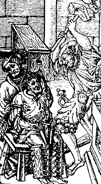 [They put] the legs of the patient between two planks of wood, which they bind with cords, between which they put wedges, and make them enter by blows of a hammer to squeeze the legs...[and] the bones of the legs do crack and fall in pieces when they are unloosed; and those who have undergone this torture, die a little time after .