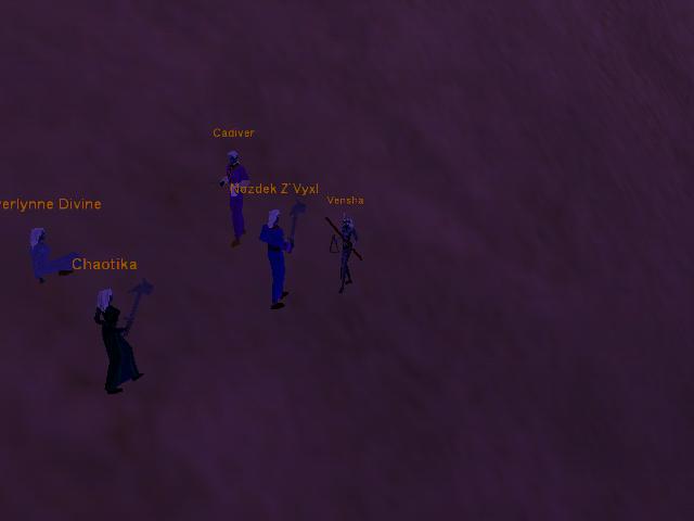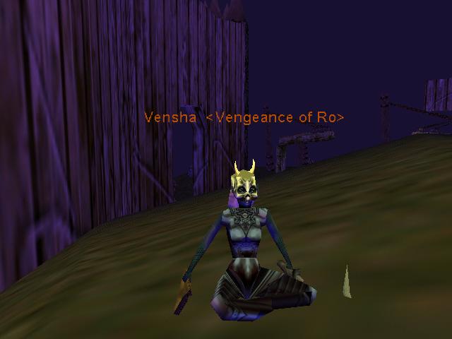 Main: Vensha, Dark Elf Warrior, lvl 39 (Vengeance of Ro") VoR is her darkie and peekay happi guild, that really kicks ass, fyi. When she first met them all So you get a lil idea of her, this is her pic in the giant fort sittin down.