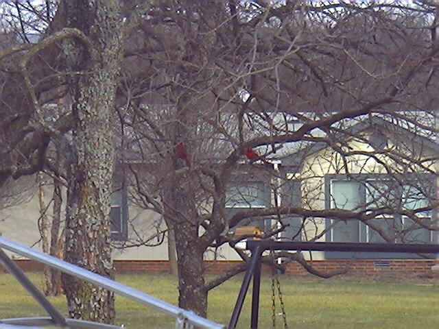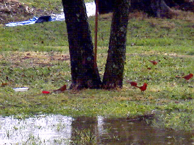 All of these are male cardinals. If you are wondering about the bowl and the lid on the ground, I used them for peanut butter and bacon grease servings. I had to do some pic editing to this one because it was very dark and stormy that day.