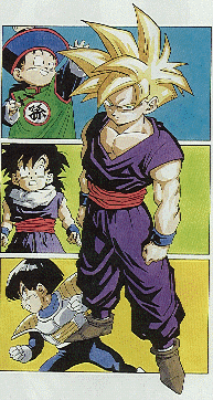 Characteristics: Goku is a natural playful boy. He likes to fight, and enjoys it when he opponents are stronger than him. When he has his tail he has the ability to transform into a giant ape (Oozaru) when he looks at the full moon. During this stage his strength increases by ten but he becomes completly uncontrolable. Also Goku reaches the level of the Legendary Super Saiyen when he is on Namek battling Freiza. During his training in Heaven, Goku surpasses that by going to the second level of Super Saiyen. Later on in the Boo saga, Goku reaches the third level of Super Saiyan.
