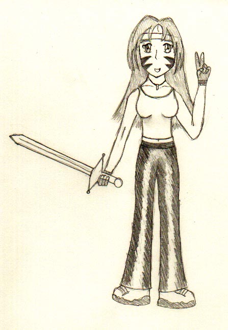 *@* B&W pencil sketch of Gundam Pilot 06 (Otaku Senshi) with sword and tribal war paint on her face.