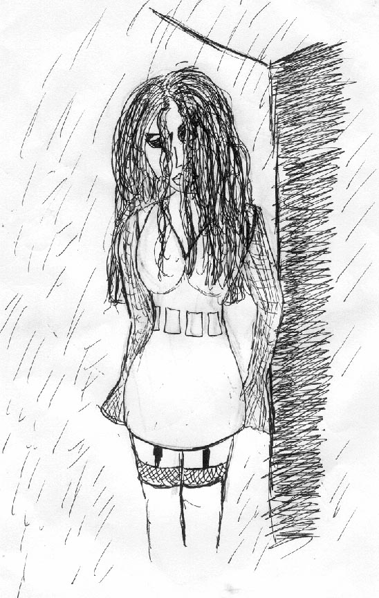 *@* A b&w ink sketch of a girl standing in the rain looking.. errm.. goth?
