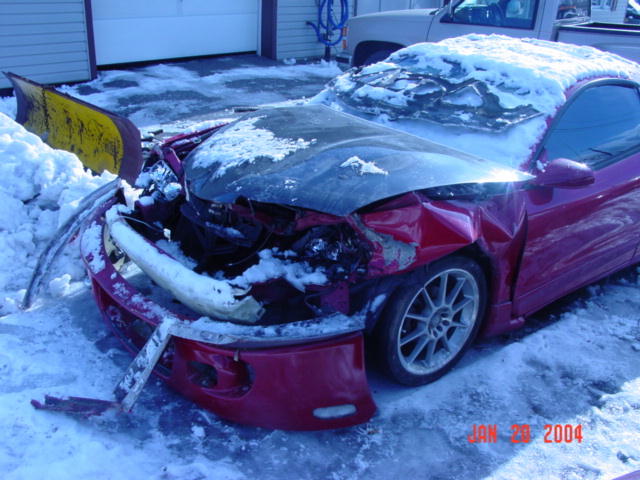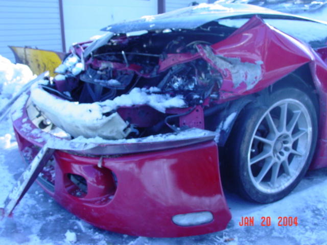 well here are the pics of heffs eclipse after the accident. obviously totalled, if you couldn't gather that yourself. as the story goes, heff was on his way to work, early AM. the roads were icy and snowcovered, and he was driving on rockvale road, towards rockvale. the section of that road that is bordered by the lancaster host golf course on the left, there is an S-curve. well, simply put, when the S-curve went left, heffs car went straight. rite into the fence in some guys yard that was conviniently made out of telephone pole. so heffs car really didnt stand a chance. below is the aftermath