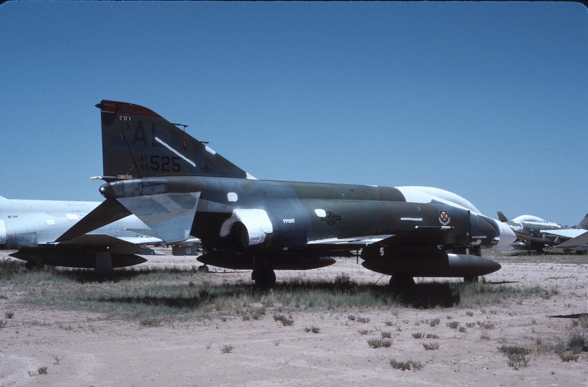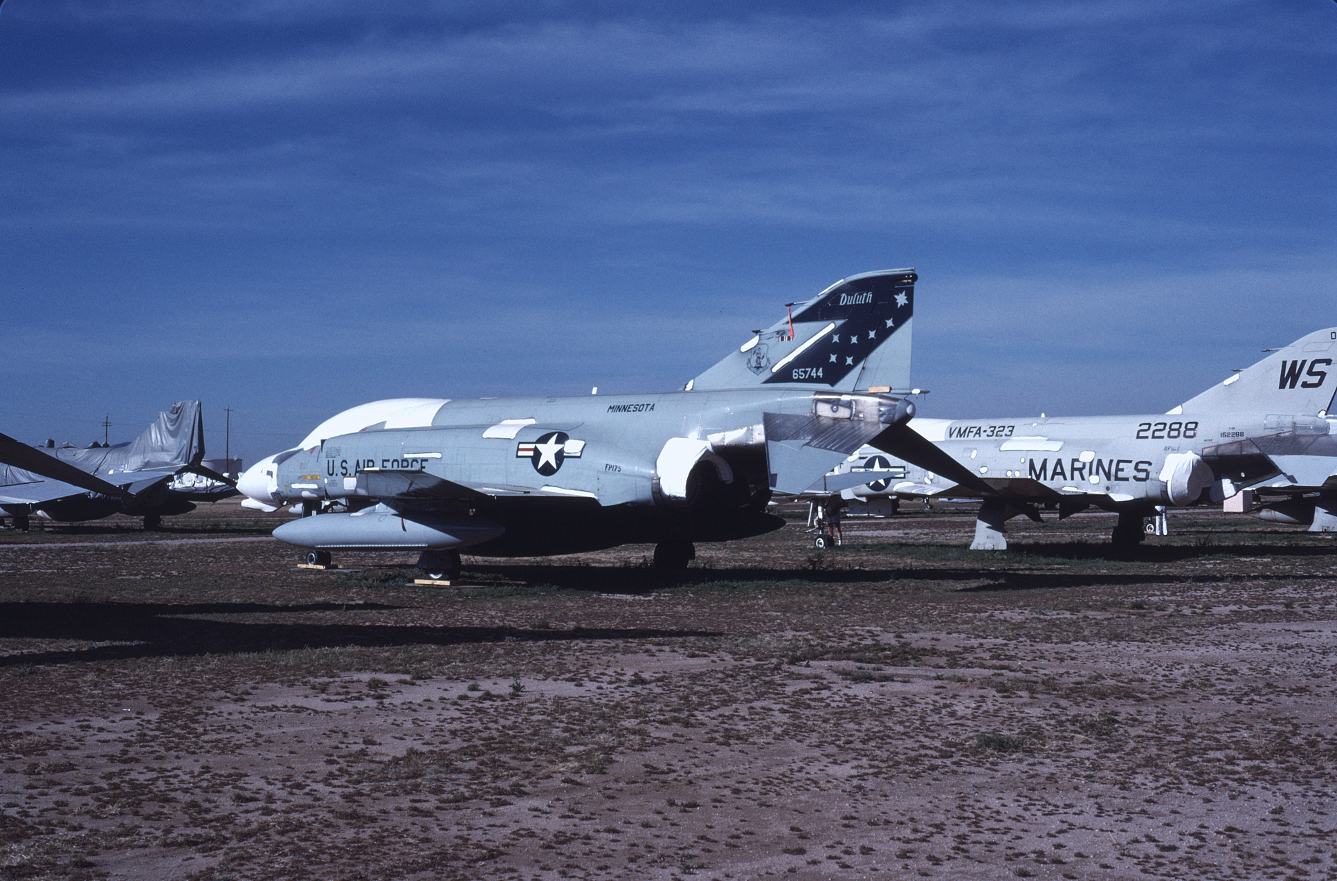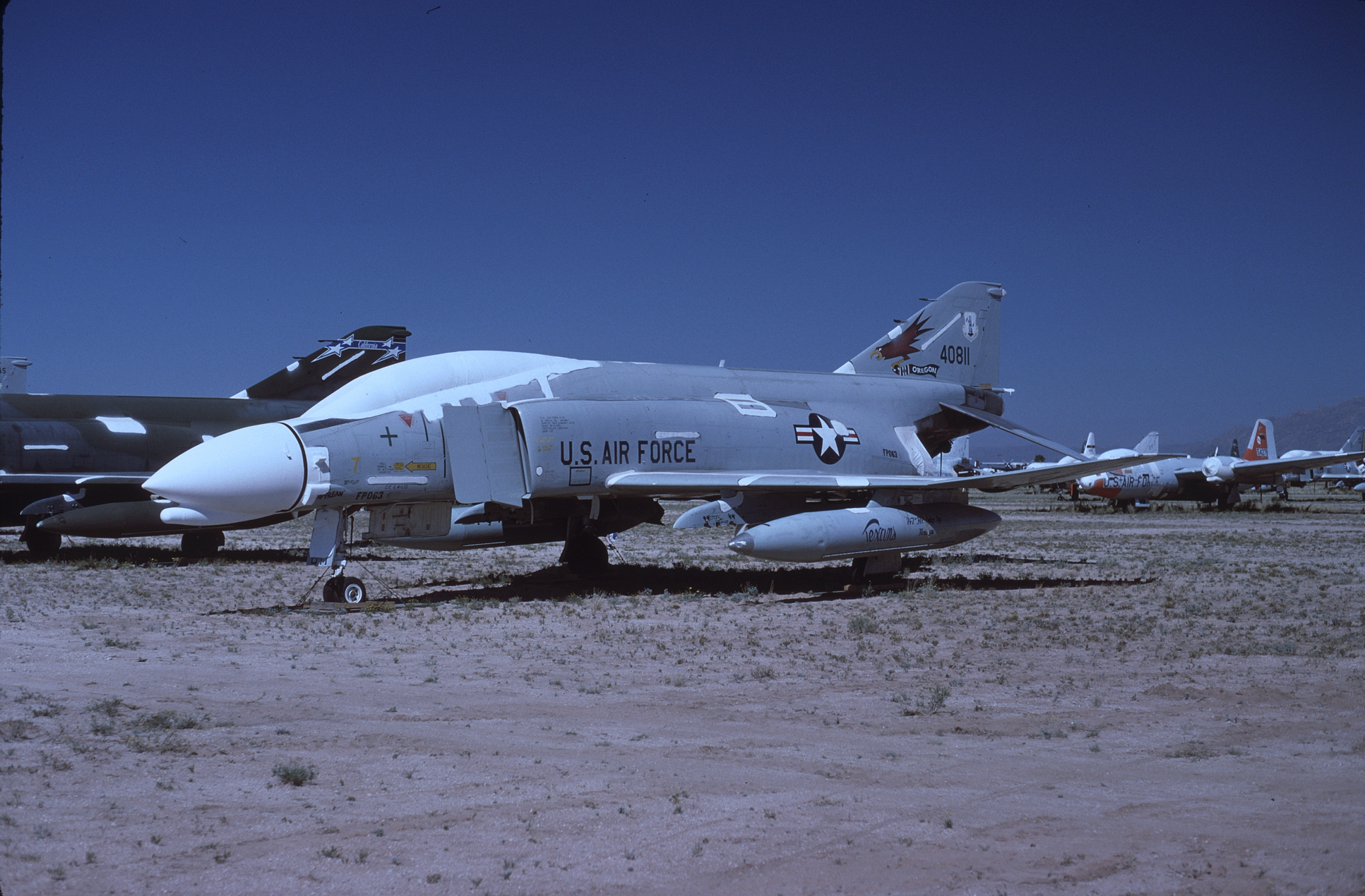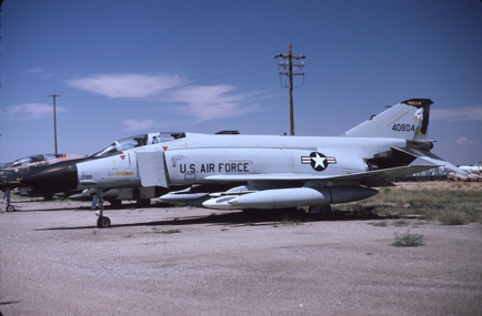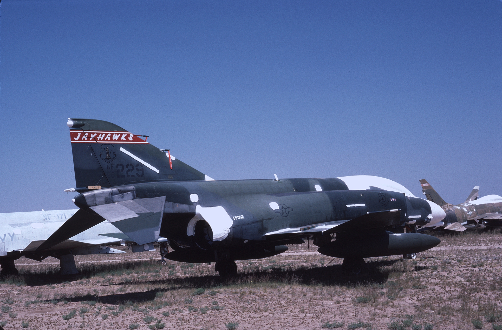 The Kansas ANG was responsible for F-4 training during the 1980s and had over forty F-4Ds assigned at one time. With so many aircraft the Jayhawks sported every camouflage scheme used by the USAF in the '80s. 65-0643 at AMARC in the attractive overall ADC Gray paint job while next to her is 65-0701 in the FUGLY Euro 1 scheme. (CB)