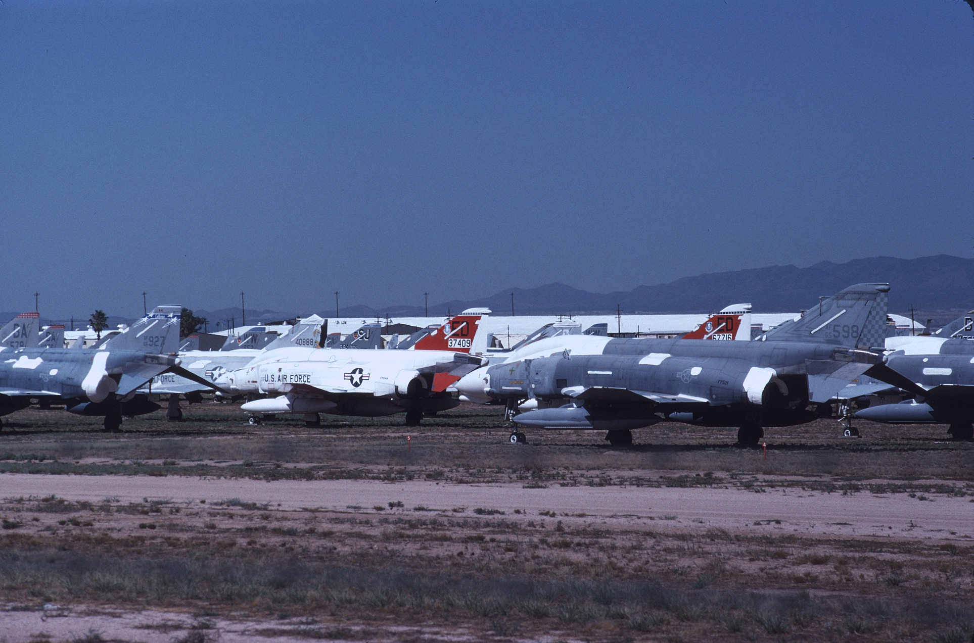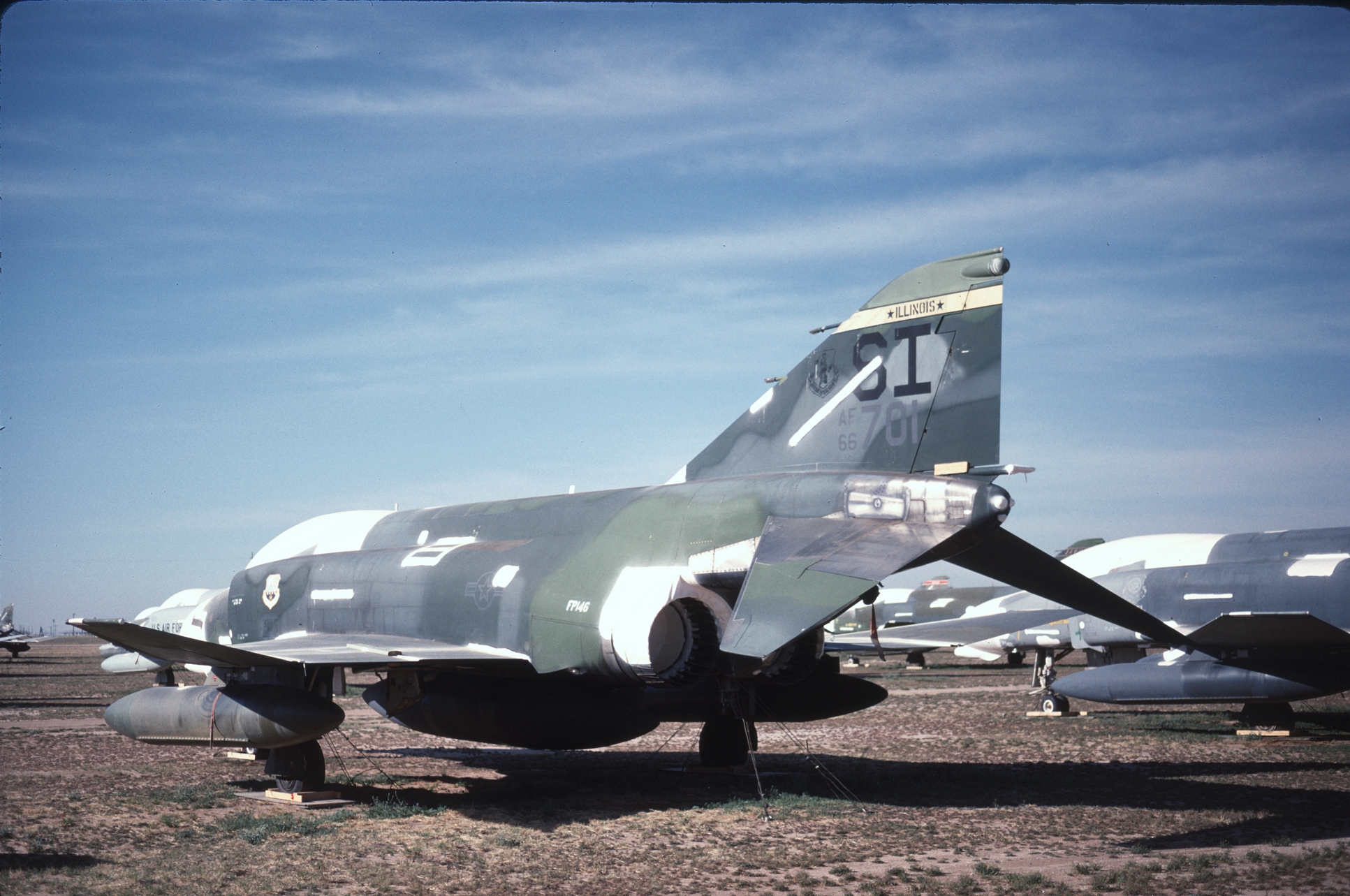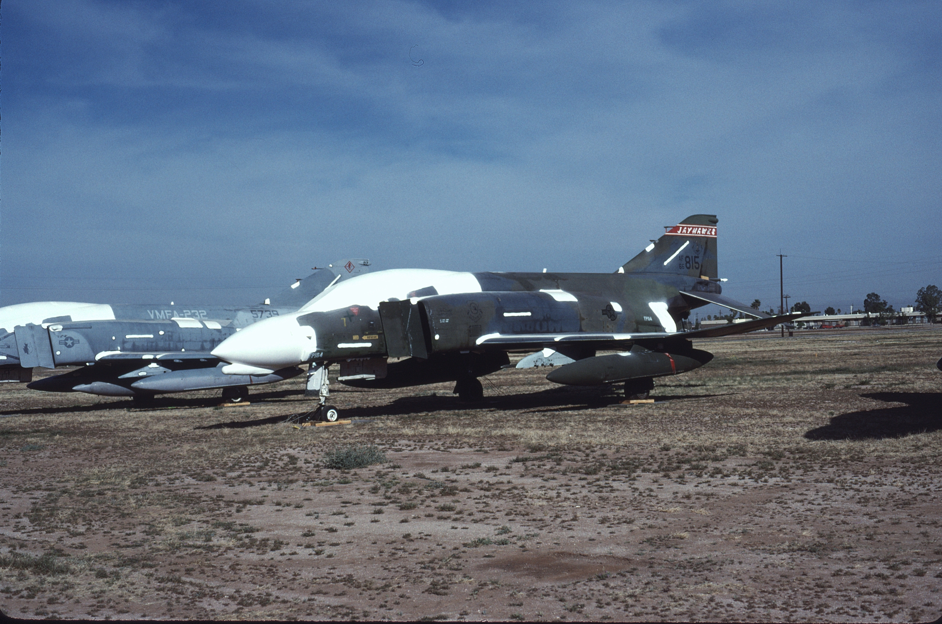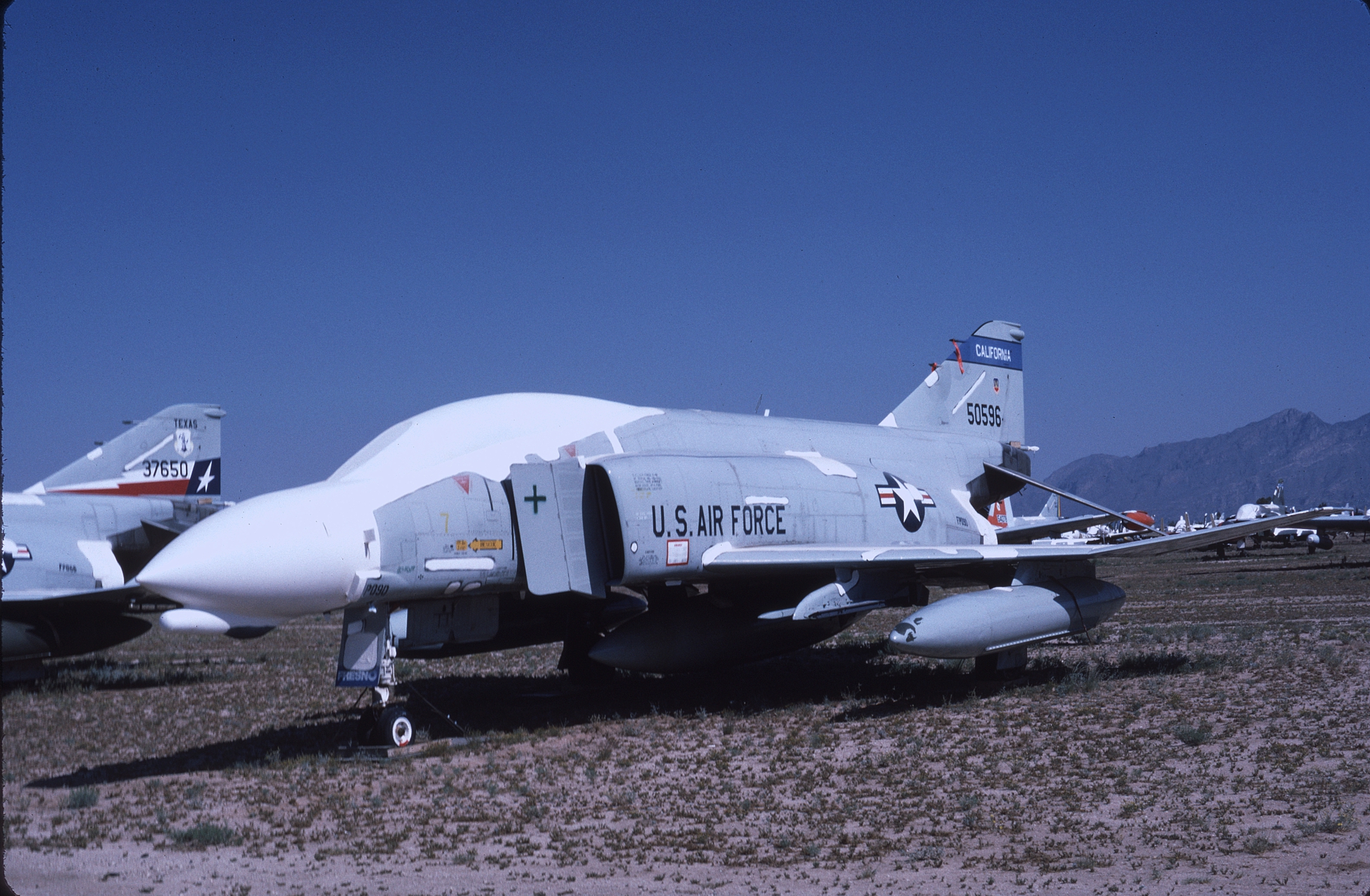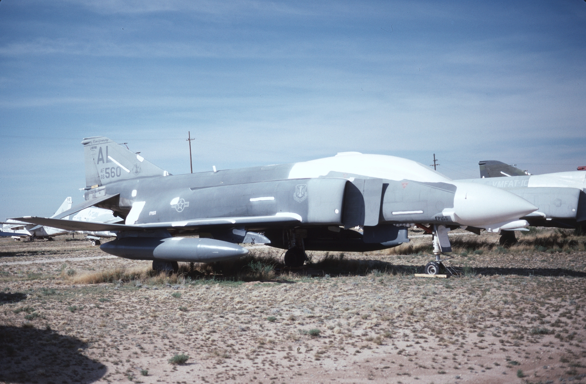 The Kansas ANG was responsible for F-4 training during the 1980s and had over forty F-4Ds assigned at one time. With so many aircraft the Jayhawks sported every camouflage scheme used by the USAF in the '80s. 65-0643 at AMARC in the attractive overall ADC Gray paint job while next to her is 65-0701 in the FUGLY Euro 1 scheme. (CB)