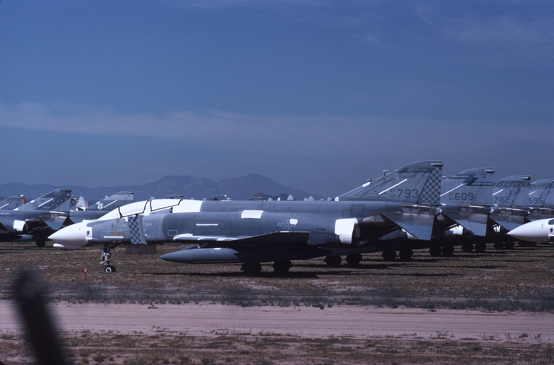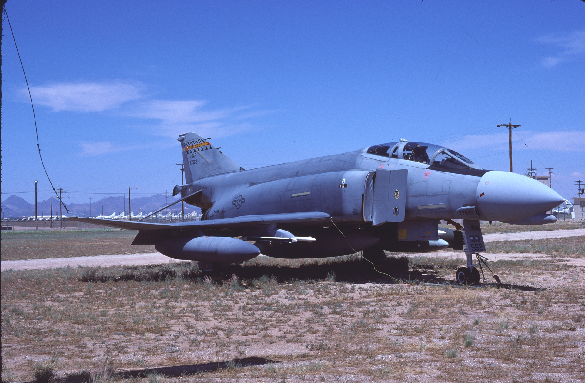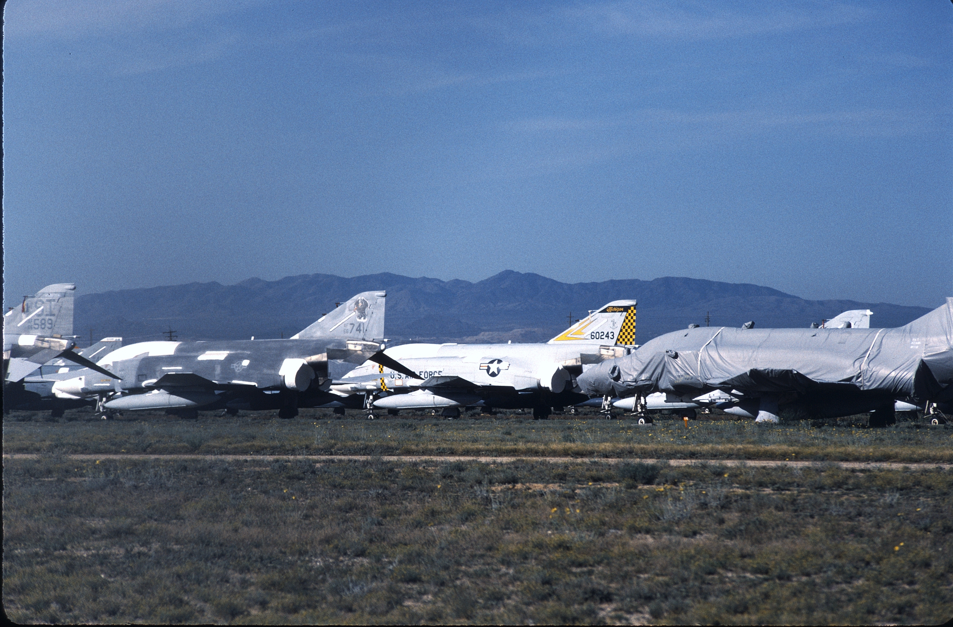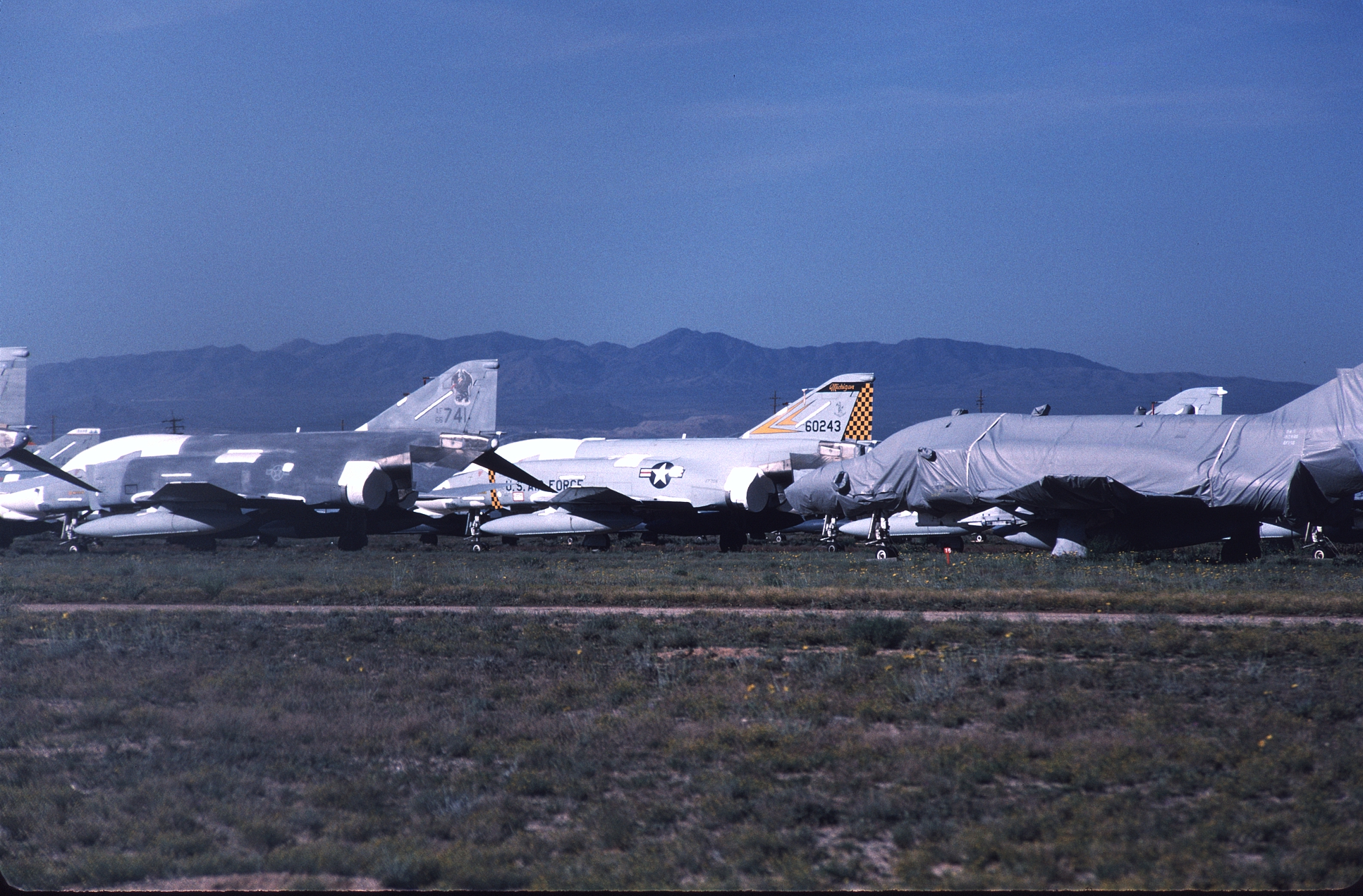 The Kansas ANG was responsible for F-4 training during the 1980s and had over forty F-4Ds assigned at one time. With so many aircraft the Jayhawks sported every camouflage scheme used by the USAF in the '80s. 65-0643 at AMARC in the attractive overall ADC Gray paint job while next to her is 65-0701 in the FUGLY Euro 1 scheme. (CB)