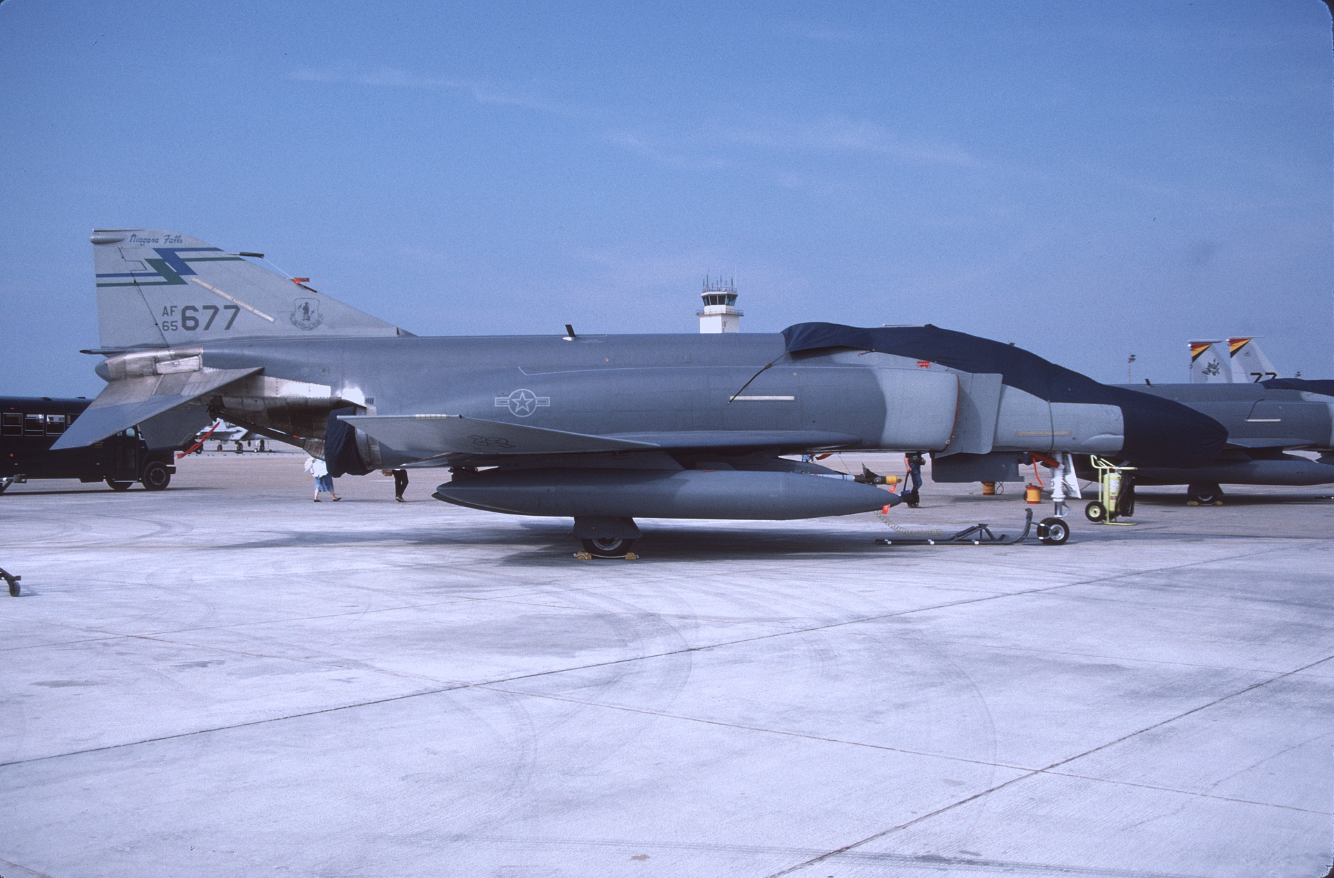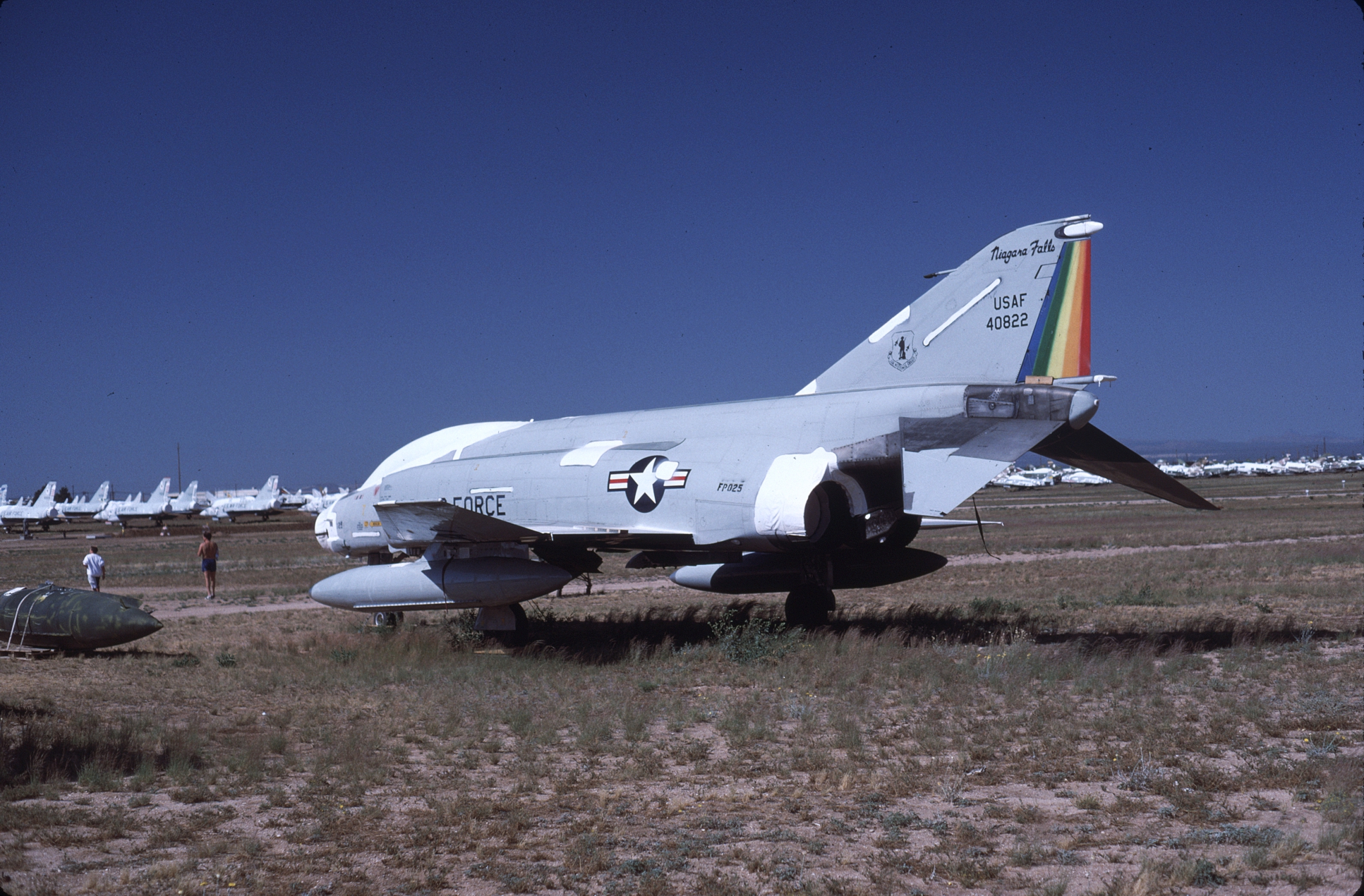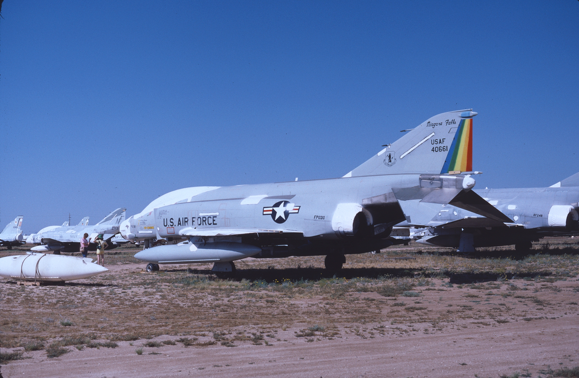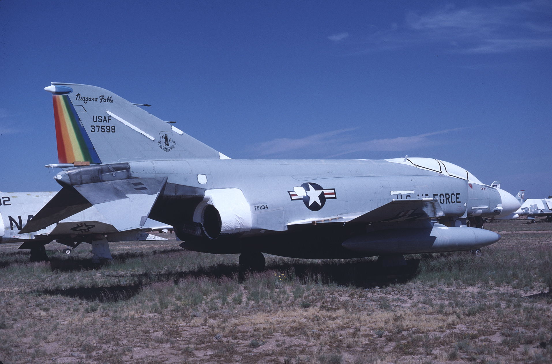 The Niagara Falls based 136th had rainbow stripes on the tail of the unit's F-4Cs. At one time Monogram chose this scheme for their 48th scale F-4C. 63-7541, -7568, -7568 (after spraylatting), and -7598, all at AMARC. 63-7662 on final. (CB)