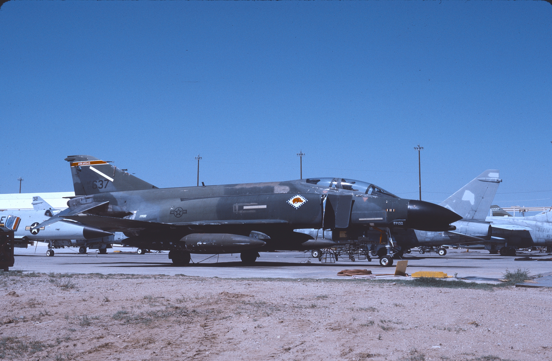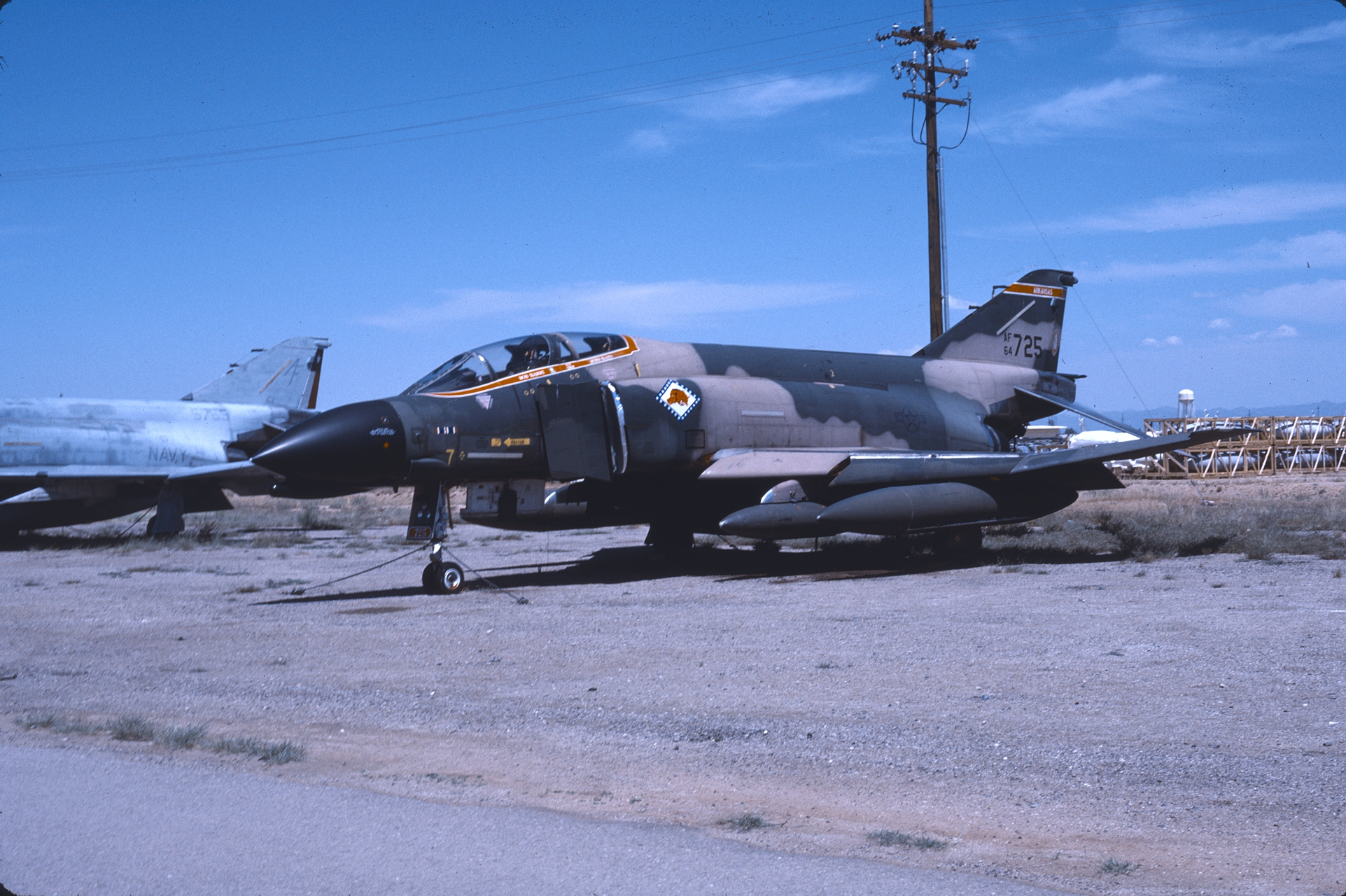 Another former Hun unit, the 184th traded in their F-100Ds and Fs for F-4Cs in 1979. With the F-4s they used several schemes; i.e. SEA, Euro 1, and the Hill schemes. 63-7542 at AMARC. -7637 in the Euro 1 scheme. Easily the ugliest scheme ever carried on a Phantom. 64-0725 and -0780 at AMARC. All carry the Arkansas Razorback in a diamond on the fuselage. (CB)