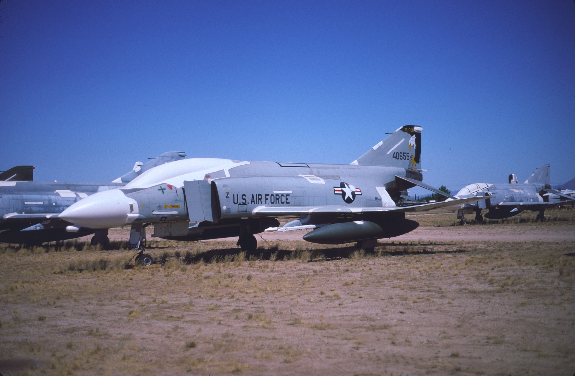 The Eagle painted on the tail of the 114th's Phantoms was one of the more distinctive tail markings applied to F-4s. Even the "subdued" Eagle is very visible. All of these photos were taken after these birds arrived at AMARC. F-4C 63-7549, 64-0655, -0673, -0804. (CB)