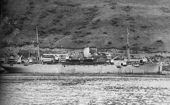 The first photo shows the Tjisadane in (I believe) the Aleutians. The second one is most likely New Zealand, or New Caledonia. The dramatic drawing is of a Kamikaze striking the ship at Okinawa and takes some artistic license of the actual event *. The next to last photo is of a model of the ship and the final one is what I like to think of as "The Tjisadane sailing into history".