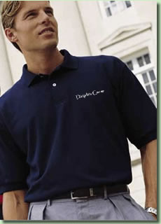 50% cotton 50% polyester, 5.6oz., contoured collar and cuffs, double-needle
