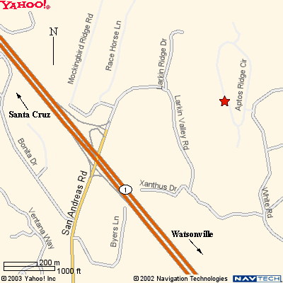 ![]() To Santa Cruz from San Jose Airport (SJC): Exit the airport using Airport Parkway and turn right onto Old Bayshore Highway. Follow this road until the on-ramp for U.S. 101 South. Very soon you take the exit ramp onto Interstate 880 South. 880 will eventually turn into California Highway 17-South. Follow this highway through Los Gatos and over the Santa Cruz mountains to Santa Cruz, where you will take the exit onto Highway 1 South. To Santa Cruz from Oakland Airport (OAK): When you leave the airport, follow the signs to Interstate 880 South. Follow the highway about 40 miles to San Jose, where it will eventually turn into California Highway 17-South. Follow this highway through Los Gatos and over the Santa Cruz mountains to Santa Cruz, where you will take the exit onto Highway 1 South. To Santa Cruz from San Francisco Airport (SFO): Leaving the airport, take U.S. 101 South. After about 20 miles, you will exit onto California Highway 85-South (to Cupertino/San Jose). After another 10 miles or so, you will take the ramp leading to California Highway 17 (to Santa Cruz). Follow 17 South over the Santa Cruz mountains to Santa Cruz, where you will take the exit onto Highway 1 South. Driving Directions to the Wedding Site Our wedding will take place at: 750 Aptos Ridge Circle, Watsonville, CA 95076. The location is actually much closer to Aptos and Santa Cruz than Watsonville proper. From Santa Cruz and points north: Take Highway 1 south. Exit San Andreas Rd./Larkin Valley Rd. Take a left onto Larkin Valley. Follow Larkin Valley to the top of the hill. Turn left on White Rd. Follow White Rd. for about 1/2 mile, then turn left onto Aptos Ridge Circle at the gate. From Watsonville and points south: Take Highway 1 north. Exit San Andreas Rd./Larkin Valley Rd. Take a right onto Larkin Valley. Follow Larkin Valley to the top of the hill. Turn left on White Rd. Follow White Rd. for about 1/2 mile, then turn left onto Aptos Ridge Circle at the gate.