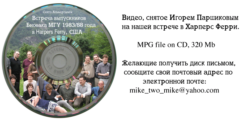 Встреча нашего курса в штате Мерилэнд прошла в невероятно теплой и дружественной обстановке во многом благодаря неустанным усилиям оргкомитета и отдельных участников встречи. В ходе подготовки к Мерилэндской встрече были созданы фотостраницы и список курса, так что практически все участники были без труда "опознаны" на месте своими однокурсниками. Кульминацией встречи явился показ слайдов из тех далеких времен. По нашим данным Московская встреча курса состоится 16 или 17 октября 2003 г. на Биофаке и в десятке. Вступительный взнос - 500 руб. ($20). Оргкомитет: Слава Дубынин, Маша Дмитриева и Марина Рыхликова. Мы надеемся что Московская встреча пройдет на такой же высокой ноте и с нетерпением ждем ваших сообщений и фотографий! |