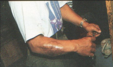 "Would I like to pet the snake?" I say I am thirsty, very thirsty. The crowd smiles and laughs as one. A few rats come by to pay a visit. With one chop of bamboo pliers, the bartender guillotines the snake, leaving its head wiggling on the table top. With help from one of his many assistants, he then squeezes the snake's blood into a half-filled glass of white arak. Two other helpers come in to peel the snake's skin. Wielding scissors, the bartender carefully extracts the gall bladder and spinal cord.