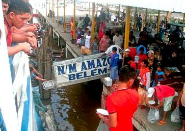 After a few days hanging around Leticia, I boarded another small riverboat, piloted by a three-man Portuguese speaking crew. I wanted to bypass the big ports so we chugged toward Benjamin Constant, the narrow river gateway that feeds into Brazil. We threaded through Benjamin Constant and plied northeasterly deeper into Brasil. The Amazon river yawned progressively wider and wider as we drew closer and closer to Manaus. It wasn't long before neither bank of the river was visible to the naked eye. In this wide expanse of water the Amazon resembles an ocean and has as many moods. International freighters and oil tankers ply these parts with frequency. In Manaus I hopped from the diesel fishing boat onto a much larger iron ship which could carry up to 300 passengers.
