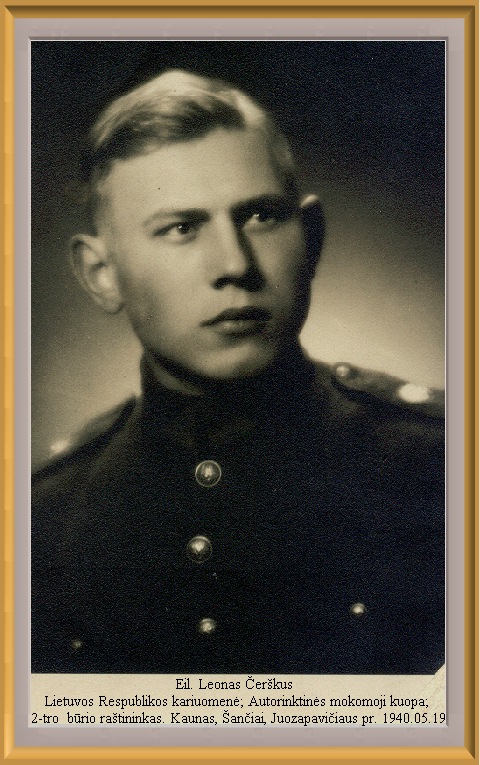6. *Leonas Čerškus, Kazio, (g.1918), 17 PTO PtDn eilinis iš Kauno. Varomas kartu su besitraukiančia Sovietų kariuomene, buvo NKVD suimtas prie Maladečinos; su kitais kaliniais varytas už Minsko. Išliko per masines NKVD žudynes. Grįžo į Lietuvą, kartu su studentu Leonu, Leonu Š. ir dar vienu, kuris prisijungė vėliau ("ūkininku iš Dzūkijos"). Suimtas 1945.09.13; kalintas (Skuodo, Rygos lageriuose) iki 1947. 1948 vėl suimtas, nuteistas 25+5 m.; kalintas KSDK, Kolymos lageriuose, Čiukotkoje. 1956 paleistas grįžo į Lietuvą. Gyvena Kaune. (10)