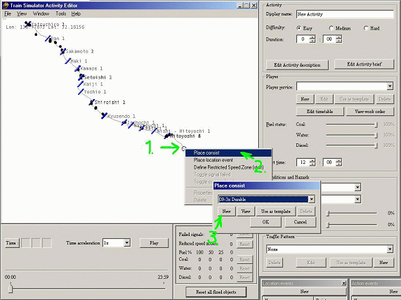 Ved begge bokse trykker du, Ok. Derefter kommer ruten den valgte rute frem, så zoomer du ind, ved at holde højre museknap nede og rykke musen op eller ned. Højre klik et sted (1), hvor der kun er ”steger” (som er sporet). Tryk, Place Consist (2), der kommer der en lille boks frem der hedder Place Consist (2), der trykker du New (3), som på billedet. |
